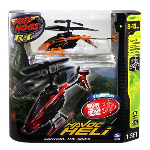 - Experience the thrill of indoor flight with the Air Hogs R/C Havoc Heli - North America's #1 selling R/C Helicopter!^Infrared Remote Control comes in multiple frequencies allowing up to 3 pilots to fly Havoc Helis in the same room^Accurately navigates tight corners and sharp curves with 5 directional control^The Havoc Heli is made of a high-composite body that is highly durable against crash landings. Made for ages 8+^Includes: 1 Air Hogs RC Havoc Heli, 1 Controller/Charger, Spare Tail Propellar, 1 Rotor removal Tool, 1 User Instruction Guide, Requires 6 AA batteries, not included.